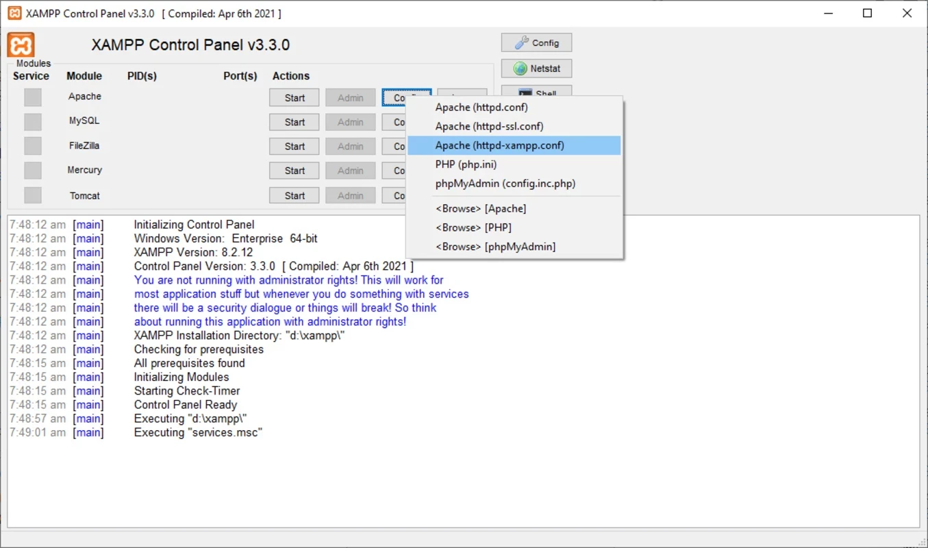 بعد التثبيت، انتقل إلى لوحة التحكم وانقر على زر "ابدأ". سيُطلب منك الانتقال إلى "وحدة التحكم" لبدء تشغيل Apache وMySQL. يمكنك الوصول إلى لوحة التحكم من خلال الانتقال إلى http://localhost باستخدام متصفح ويب مثل Google Chrome . حدد مجلد htdocs من مجلد التثبيت لحفظ ملفات الويب، وقم بإدارة قاعدة البيانات أثناء الوصول إلى phpMyAdmin عبر http//:localhost/phpmyadmin. انقر على خيار "إيقاف" لإيقاف الخدمات من لوحة التحكم. تحتوي لوحة التحكم على المكونات المهمة التالية: