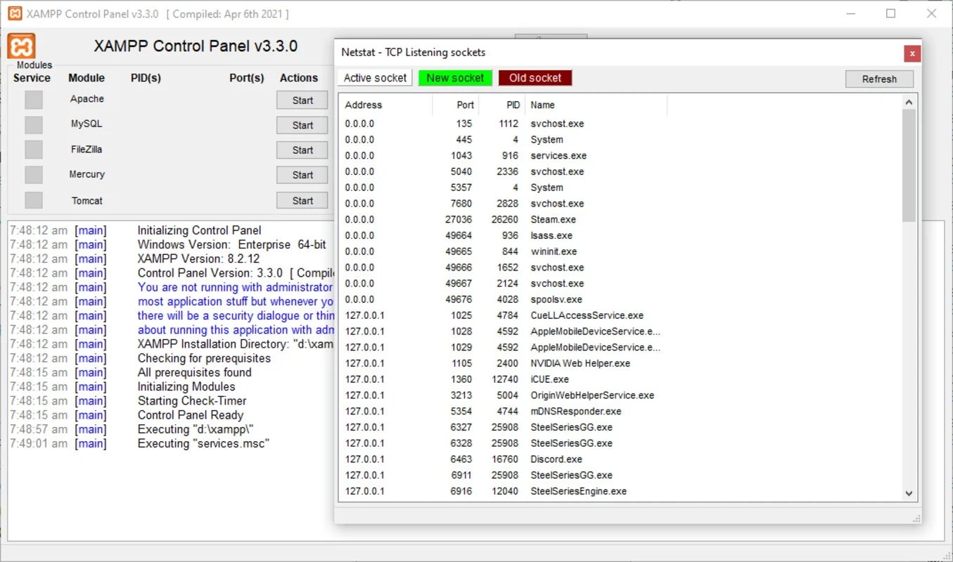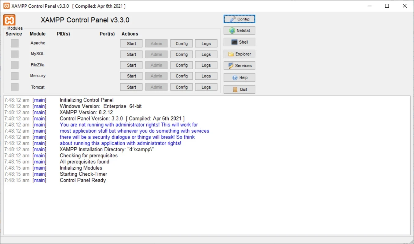 • يوفر "التحكم في الوحدة النمطية" أزرارًا بسيطة لبدء وإيقاف الخدمات مثل Apache وMySQL.